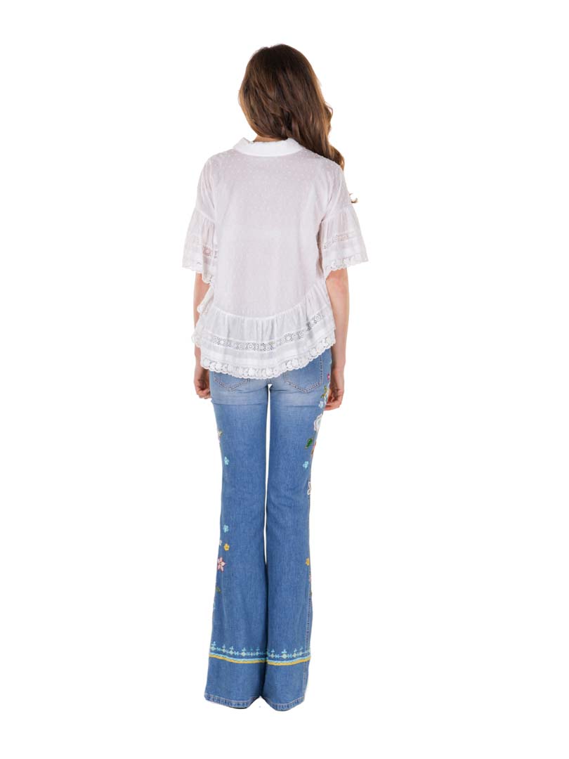 Jeans Codice prodotto S2366 Jeans ricamato con perline, chiusura con bottone e zip, passanti per la cintura, gamba svasata, multi tasche.