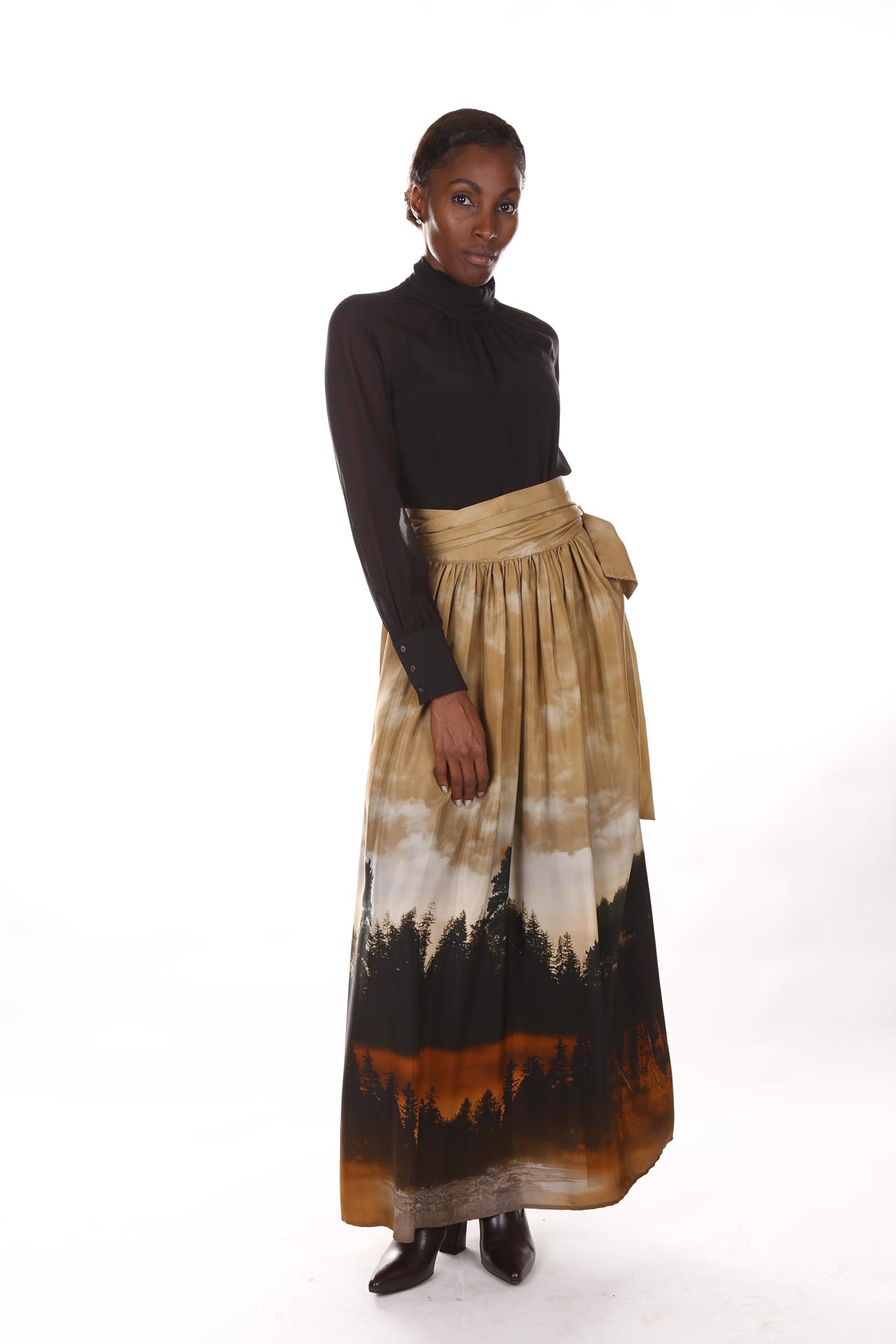 Gonna Codice prodotto WG003 Gonna in seta lunga, vita alta, arricciatura e fiocco in vita, spacco laterale.